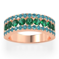 This Emerald wedding ring is casted in 18K Rose Gold and set with fine quality Emerald and Swiss Blue Topaz. All of the gemstones we use are of the top 10% available, those found in fine quality boutiques across the world. This Emerald wedding band can also be added to your collection of minimalist Emerald rings. This Band Features A Captivating Three-row Diamond Design, with A Central Row Of Larger Diamonds Flanked By Smaller Stones. Free shipping, returns, resizing, and a lifetime warranty ensure you love your purchase.