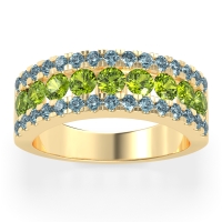 This Peridot wedding ring is casted in 14k Yellow Gold and set with fine quality Peridot and Aquamarine. All of the gemstones we use are of the top 10% available, those found in fine quality boutiques across the world. This Peridot wedding band can also be added to your collection of minimalist Peridot rings. This Band Features A Captivating Three-row Diamond Design, with A Central Row Of Larger Diamonds Flanked By Smaller Stones. Free shipping, returns, resizing, and a lifetime warranty ensure you love your purchase.