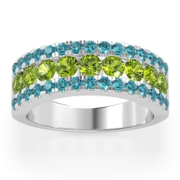 This Peridot wedding ring is casted in 14k White Gold and set with fine quality Peridot and Swiss Blue Topaz. All of the gemstones we use are of the top 10% available, those found in fine quality boutiques across the world. This Peridot wedding band can also be added to your collection of minimalist Peridot rings. This Band Features A Captivating Three-row Diamond Design, with A Central Row Of Larger Diamonds Flanked By Smaller Stones. Free shipping, returns, resizing, and a lifetime warranty ensure you love your purchase.