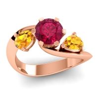 This 14K Rose Gold Ruby ring features a AAAA Emerald Ruby, along with fine quality Citrine. This Modern Ring Is Fun And Stylish. Your Round Brilliant Gem Sits in A 6 Prong Bypass Setting with A Knife Edge Band. The Center Stone Is Accented with Two Smaller Pear Shape Gems. We only use the top 10% of gems available, those found in the finest jewelry shops across the world. This Ruby engagement ring can also be worn as an Ruby and Citrine gemstone ring and added to your collection! Enjoy Free Shipping and Returns, Free Resize and a lifetime warranty.