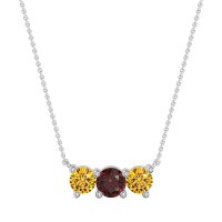 This Citrine and Ruby Necklace is casted in Platinum. This Women’s Classic necklace features exceptionally fine gemstones, on par with those found in the world's most exclusive boutiques and among the top 10% available globally. Elegant Curved Pendant Featuring Three Round Stones Set Horizontally. A Refined And Understated Design That Adds A Touch Of Subtle Sparkle. This necklace comes with a complimentary 18-inch chain. Enjoy the confidence of our 30-day, stress-free return policy—with return shipping fully covered. Each piece is also accompanied by a Lifetime Warranty, ensuring lasting beauty and peace of mind.