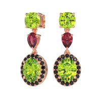 These 18K Rose Gold Peridot earrings feature fine quality with Natural Peridot, Black Onyx and Ruby gemstones. These Dangling Drop Earrings Feature A Captivating Three-tier Design, Ensuring Brilliant Movement And Sophisticated Sparkle. Each Earring Begins With A 6mm Round Stone At The Top, Transitioning Gracefully To A Pear-shaped Stone In The Center, And Culminating In A Large, Radiant Oval-shaped Stone Encircled By A Dazzling Halo At The Bottom. This Harmonious Cascade Of Shapes Creates A Truly Eye-catching Statement. Free shipping, returns, and a lifetime warranty make luxury worry-free.