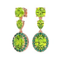 These Peridot earrings and made in 14K Rose Gold with top quality Natural Peridot and Emerald gemstones. These Dangling Drop Earrings Feature A Captivating Three-tier Design, Ensuring Brilliant Movement And Sophisticated Sparkle. Each Earring Begins With A 6mm Round Stone At The Top, Transitioning Gracefully To A Pear-shaped Stone In The Center, And Culminating In A Large, Radiant Oval-shaped Stone Encircled By A Dazzling Halo At The Bottom. This Harmonious Cascade Of Shapes Creates A Truly Eye-catching Statement. Free shipping, returns, and a lifetime warranty make luxury worry-free