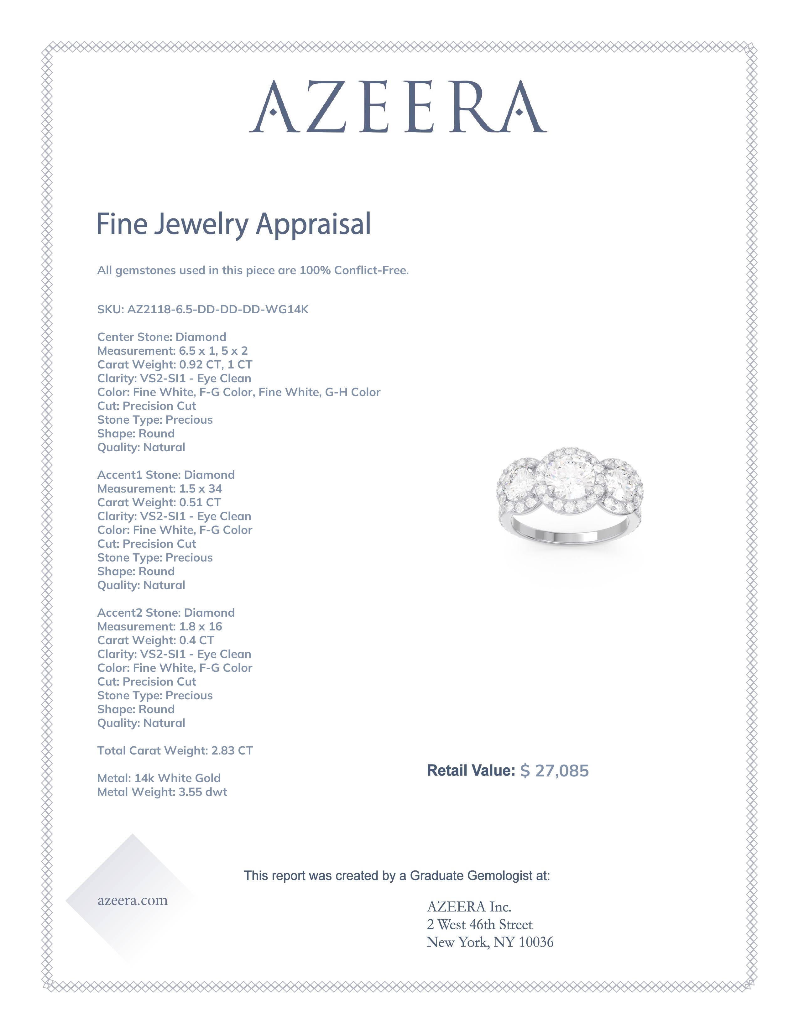 This 14k White Gold Diamond ring features a Round Diamond stone, found across the finest boutiques in the world. We only use gems that are within the top 10% of material available. This ring can be worn as an Diamond engagement ring, or can also be added to your collection of gemstone rings. This Ring Features A Large Round Brilliant Gem with Two Smaller Round Sides Each Surrounded By A Halo in Raised Setting. Smaller Rounds in A Pave Setting Also Cascade Three Quarters Of The Way Down Shank. Customize And Build Your Own Engagement Ring By Selecting The Gems And Metals Of Your Choice. We offer Free Shipping and Free Returns, along with a Free Resize. This ring also comes with a lifetime warranty which covers the integrity of our workmanship forever.