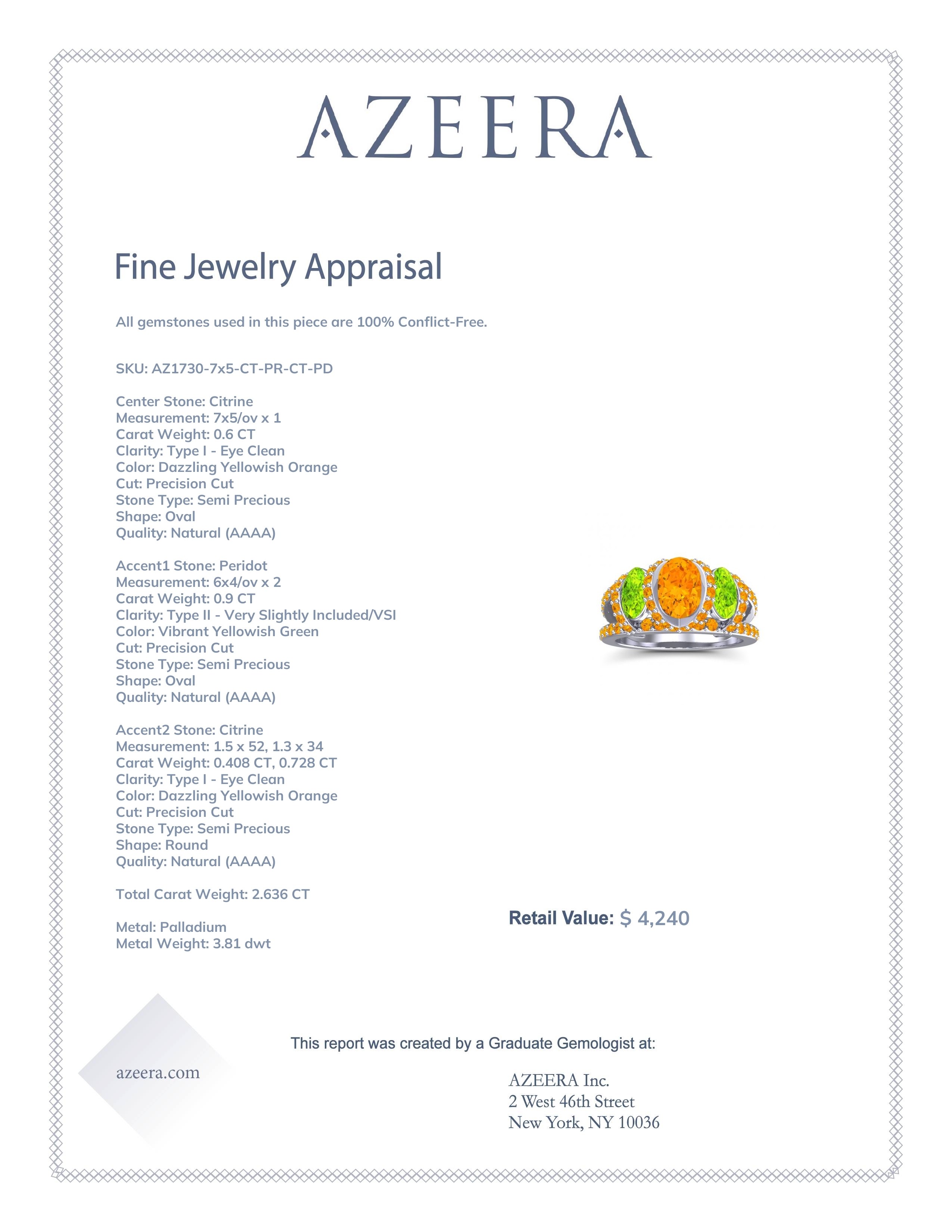 This Palladium Citrine ring features a AAAA Oval Citrine, along with fine quality Peridot. This Opulent Ring Has A Touch Of Modern To Make It Stylish And Seductive. Your Oval Cut Gem Sits in A Channel Setting Between A Modified Halo Accented with Two Smaller Oval Cut Side Stones in A Similar Channel Sitting. A Split Shank Supports The Three Stone Set with A Smaller Round Brilliant Pave Around The Majority Of The Band. We only use the top 10% of gems available, those found in the finest jewelry shops across the world. This Citrine engagement ring can also be worn as an Citrine and Peridot gemstone ring and added to your collection! Enjoy Free Shipping and Returns, Free Resize and a lifetime warranty.