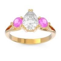 This 18k Yellow Gold Diamond ring features a AAAA Pear Diamond, along with fine quality Pink Tourmaline. This Ring Features A Large Pear Shape Gem in A Three Stone Setting Accented with Small Round Brilliants. We only use the top 10% of gems available, those found in the finest jewelry shops across the world. This Diamond engagement ring can also be worn as an Diamond and Pink Tourmaline gemstone ring and added to your collection! Enjoy Free Shipping and Returns, Free Resize and a lifetime warranty.