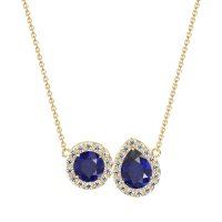 This Lab Blue Sapphire and Lab Diamond Necklace is casted in 18k Yellow Gold. This Women’s Halo necklace features exceptionally fine gemstones, on par with those found in the world's most exclusive boutiques and among the top 10% available globally. This Enchanting "toi Et Moi" Pendant Beautifully Unites A Pear-shaped And A Round Stone, Set intimately Side-by-side. Each Gem Is Embraced By Its Own Sparkling Halo, Creating A Harmonious And Radiant Symbol Of Connection. This necklace comes with a complimentary 18-inch chain. Enjoy the confidence of our 30-day, stress-free return policy—with return shipping fully covered. Each piece is also accompanied by a Lifetime Warranty, ensuring lasting beauty and peace of mind.