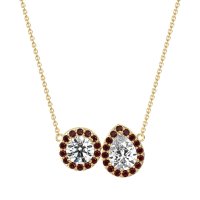 This Lab Diamond and Ruby Necklace is casted in 14k Yellow Gold. This Women’s Halo necklace features exceptionally fine gemstones, on par with those found in the world's most exclusive boutiques and among the top 10% available globally. This Enchanting "toi Et Moi" Pendant Beautifully Unites A Pear-shaped And A Round Stone, Set intimately Side-by-side. Each Gem Is Embraced By Its Own Sparkling Halo, Creating A Harmonious And Radiant Symbol Of Connection. This necklace comes with a complimentary 18-inch chain. Enjoy the confidence of our 30-day, stress-free return policy—with return shipping fully covered. Each piece is also accompanied by a Lifetime Warranty, ensuring lasting beauty and peace of mind.