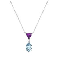 This Aquamarine and Amethyst Necklace is casted in 14k White Gold. This Women’s Classic necklace features exceptionally fine gemstones, on par with those found in the world's most exclusive boutiques and among the top 10% available globally. Striking Geometric Pendant Featuring A Triangular Stone Above A Larger, Pear-shaped Stone. Sleek Metalwork Enhances The Modern Design. This necklace comes with a complimentary 18-inch chain. Enjoy the confidence of our 30-day, stress-free return policy—with return shipping fully covered. Each piece is also accompanied by a Lifetime Warranty, ensuring lasting beauty and peace of mind.