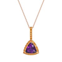 This Amethyst and Citrine Necklace is casted in 14K Rose Gold. This Women’s Halo necklace features exceptionally fine gemstones, on par with those found in the world's most exclusive boutiques and among the top 10% available globally. This Trillion Halo Pendant Featuring A Striking Trillion-cut Center Stone, Surrounded By Smaller Gems. A Delicate Row Of Smaller Stones Extends Up To The Bail, Adding A Touch Of Refined Sparkle. This necklace comes with a complimentary 18-inch chain. Enjoy the confidence of our 30-day, stress-free return policy—with return shipping fully covered. Each piece is also accompanied by a Lifetime Warranty, ensuring lasting beauty and peace of mind.