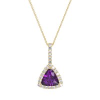This Amethyst and Lab Diamond Necklace is casted in 18k Yellow Gold. This Women’s Halo necklace features exceptionally fine gemstones, on par with those found in the world's most exclusive boutiques and among the top 10% available globally. This Trillion Halo Pendant Featuring A Striking Trillion-cut Center Stone, Surrounded By Smaller Gems. A Delicate Row Of Smaller Stones Extends Up To The Bail, Adding A Touch Of Refined Sparkle. This necklace comes with a complimentary 18-inch chain. Enjoy the confidence of our 30-day, stress-free return policy—with return shipping fully covered. Each piece is also accompanied by a Lifetime Warranty, ensuring lasting beauty and peace of mind.