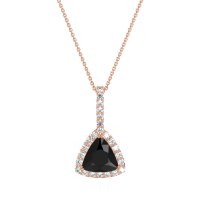 This Black Onyx and Lab Diamond Necklace is casted in 14K Rose Gold. This Women’s Halo necklace features exceptionally fine gemstones, on par with those found in the world's most exclusive boutiques and among the top 10% available globally. This Trillion Halo Pendant Featuring A Striking Trillion-cut Center Stone, Surrounded By Smaller Gems. A Delicate Row Of Smaller Stones Extends Up To The Bail, Adding A Touch Of Refined Sparkle. This necklace comes with a complimentary 18-inch chain. Enjoy the confidence of our 30-day, stress-free return policy—with return shipping fully covered. Each piece is also accompanied by a Lifetime Warranty, ensuring lasting beauty and peace of mind.