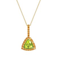 This Peridot and Citrine Necklace is casted in 14k Yellow Gold. This Women’s Halo necklace features exceptionally fine gemstones, on par with those found in the world's most exclusive boutiques and among the top 10% available globally. This Trillion Halo Pendant Featuring A Striking Trillion-cut Center Stone, Surrounded By Smaller Gems. A Delicate Row Of Smaller Stones Extends Up To The Bail, Adding A Touch Of Refined Sparkle. This necklace comes with a complimentary 18-inch chain. Enjoy the confidence of our 30-day, stress-free return policy—with return shipping fully covered. Each piece is also accompanied by a Lifetime Warranty, ensuring lasting beauty and peace of mind.