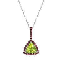 This Peridot and Ruby Necklace is casted in Platinum. This Women’s Halo necklace features exceptionally fine gemstones, on par with those found in the world's most exclusive boutiques and among the top 10% available globally. This Trillion Halo Pendant Featuring A Striking Trillion-cut Center Stone, Surrounded By Smaller Gems. A Delicate Row Of Smaller Stones Extends Up To The Bail, Adding A Touch Of Refined Sparkle. This necklace comes with a complimentary 18-inch chain. Enjoy the confidence of our 30-day, stress-free return policy—with return shipping fully covered. Each piece is also accompanied by a Lifetime Warranty, ensuring lasting beauty and peace of mind.