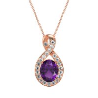 This Amethyst and Lab Diamond Necklace is casted in 14K Rose Gold. This Women’s Fashion necklace features exceptionally fine gemstones, on par with those found in the world's most exclusive boutiques and among the top 10% available globally. This Twisted infinity Oval Pendant Features An Oval Center Stone Encircled By A Halo Of Smaller Stones. The Halo Is Gracefully intertwined with An infinity Symbol. This necklace comes with a complimentary 18-inch chain. Enjoy the confidence of our 30-day, stress-free return policy—with return shipping fully covered. Each piece is also accompanied by a Lifetime Warranty, ensuring lasting beauty and peace of mind.