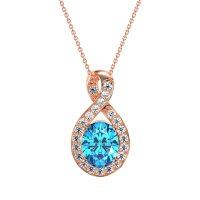 This Swiss Blue Topaz and Lab Diamond Necklace is casted in 14K Rose Gold. This Women’s Fashion necklace features exceptionally fine gemstones, on par with those found in the world's most exclusive boutiques and among the top 10% available globally. This Twisted infinity Oval Pendant Features An Oval Center Stone Encircled By A Halo Of Smaller Stones. The Halo Is Gracefully intertwined with An infinity Symbol. This necklace comes with a complimentary 18-inch chain. Enjoy the confidence of our 30-day, stress-free return policy—with return shipping fully covered. Each piece is also accompanied by a Lifetime Warranty, ensuring lasting beauty and peace of mind.