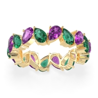 This Amethyst wedding ring is casted in 14k Yellow Gold and set with fine quality Amethyst and Emerald. All of the gemstones we use are of the top 10% available, those found in fine quality boutiques across the world. This Amethyst wedding band can also be added to your collection of minimalist Amethyst rings. This Eternity Band Boasts A Mesmerizing Design with Pear-shaped Stones Facing in Opposite Directions. Free shipping, returns, resizing, and a lifetime warranty ensure you love your purchase.