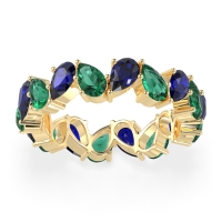 This Blue Sapphire wedding ring is casted in 14k Yellow Gold and set with fine quality Blue Sapphire and Emerald. All of the gemstones we use are of the top 10% available, those found in fine quality boutiques across the world. This Blue Sapphire wedding band can also be added to your collection of minimalist Blue Sapphire rings. This Eternity Band Boasts A Mesmerizing Design with Pear-shaped Stones Facing in Opposite Directions. Free shipping, returns, resizing, and a lifetime warranty ensure you love your purchase.