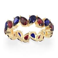This Blue Sapphire wedding ring is casted in 18k Yellow Gold and set with fine quality Blue Sapphire and Ruby. All of the gemstones we use are of the top 10% available, those found in fine quality boutiques across the world. This Blue Sapphire wedding band can also be added to your collection of minimalist Blue Sapphire rings. This Eternity Band Boasts A Mesmerizing Design with Pear-shaped Stones Facing in Opposite Directions. Free shipping, returns, resizing, and a lifetime warranty ensure you love your purchase.
