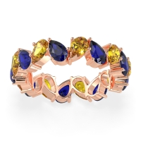 This Citrine wedding ring is casted in 18K Rose Gold and set with fine quality Citrine and Blue Sapphire. All of the gemstones we use are of the top 10% available, those found in fine quality boutiques across the world. This Citrine wedding band can also be added to your collection of minimalist Citrine rings. This Eternity Band Boasts A Mesmerizing Design with Pear-shaped Stones Facing in Opposite Directions. Free shipping, returns, resizing, and a lifetime warranty ensure you love your purchase.