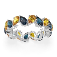 This Citrine wedding ring is casted in Palladium and set with fine quality Citrine and London Blue Topaz. All of the gemstones we use are of the top 10% available, those found in fine quality boutiques across the world. This Citrine wedding band can also be added to your collection of minimalist Citrine rings. This Eternity Band Boasts A Mesmerizing Design with Pear-shaped Stones Facing in Opposite Directions. Free shipping, returns, resizing, and a lifetime warranty ensure you love your purchase.