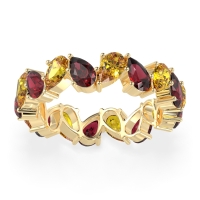 This Citrine wedding ring is casted in 18k Yellow Gold and set with fine quality Citrine and Ruby. All of the gemstones we use are of the top 10% available, those found in fine quality boutiques across the world. This Citrine wedding band can also be added to your collection of minimalist Citrine rings. This Eternity Band Boasts A Mesmerizing Design with Pear-shaped Stones Facing in Opposite Directions. Free shipping, returns, resizing, and a lifetime warranty ensure you love your purchase.