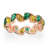 This Emerald wedding ring is casted in 18K Rose Gold and set with fine quality Emerald and Citrine. All of the gemstones we use are of the top 10% available, those found in fine quality boutiques across the world. This Emerald wedding band can also be added to your collection of minimalist Emerald rings. This Eternity Band Boasts A Mesmerizing Design with Pear-shaped Stones Facing in Opposite Directions. Free shipping, returns, resizing, and a lifetime warranty ensure you love your purchase.