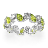 This Lab Diamond wedding ring is casted in Palladium and set with fine quality Lab Diamond and Peridot. All of the gemstones we use are of the top 10% available, those found in fine quality boutiques across the world. This Lab Diamond wedding band can also be added to your collection of minimalist Lab Diamond rings. This Eternity Band Boasts A Mesmerizing Design with Pear-shaped Stones Facing in Opposite Directions. Free shipping, returns, resizing, and a lifetime warranty ensure you love your purchase.