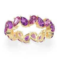 This Pink Tourmaline wedding ring is casted in 18k Yellow Gold and set with fine quality Pink Tourmaline and Amethyst. All of the gemstones we use are of the top 10% available, those found in fine quality boutiques across the world. This Pink Tourmaline wedding band can also be added to your collection of minimalist Pink Tourmaline rings. This Eternity Band Boasts A Mesmerizing Design with Pear-shaped Stones Facing in Opposite Directions. Free shipping, returns, resizing, and a lifetime warranty ensure you love your purchase.