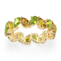 This Peridot wedding ring is casted in 18k Yellow Gold and set with fine quality Peridot and Citrine. All of the gemstones we use are of the top 10% available, those found in fine quality boutiques across the world. This Peridot wedding band can also be added to your collection of minimalist Peridot rings. This Eternity Band Boasts A Mesmerizing Design with Pear-shaped Stones Facing in Opposite Directions. Free shipping, returns, resizing, and a lifetime warranty ensure you love your purchase.