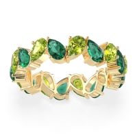 This Peridot wedding ring is casted in 14k Yellow Gold and set with fine quality Peridot and Emerald. All of the gemstones we use are of the top 10% available, those found in fine quality boutiques across the world. This Peridot wedding band can also be added to your collection of minimalist Peridot rings. This Eternity Band Boasts A Mesmerizing Design with Pear-shaped Stones Facing in Opposite Directions. Free shipping, returns, resizing, and a lifetime warranty ensure you love your purchase.