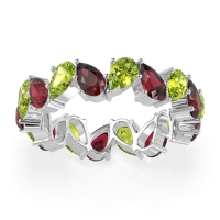 This Peridot wedding ring is casted in 14k White Gold and set with fine quality Peridot and Ruby. All of the gemstones we use are of the top 10% available, those found in fine quality boutiques across the world. This Peridot wedding band can also be added to your collection of minimalist Peridot rings. This Eternity Band Boasts A Mesmerizing Design with Pear-shaped Stones Facing in Opposite Directions. Free shipping, returns, resizing, and a lifetime warranty ensure you love your purchase.