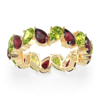 This Peridot wedding ring is casted in 14k Yellow Gold and set with fine quality Peridot and Ruby. All of the gemstones we use are of the top 10% available, those found in fine quality boutiques across the world. This Peridot wedding band can also be added to your collection of minimalist Peridot rings. This Eternity Band Boasts A Mesmerizing Design with Pear-shaped Stones Facing in Opposite Directions. Free shipping, returns, resizing, and a lifetime warranty ensure you love your purchase.