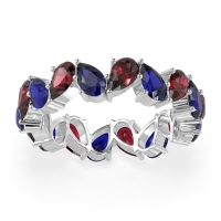 This Ruby wedding ring is casted in Platinum and set with fine quality Ruby and Blue Sapphire. All of the gemstones we use are of the top 10% available, those found in fine quality boutiques across the world. This Ruby wedding band can also be added to your collection of minimalist Ruby rings. This Eternity Band Boasts A Mesmerizing Design with Pear-shaped Stones Facing in Opposite Directions. Free shipping, returns, resizing, and a lifetime warranty ensure you love your purchase.