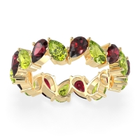 This Ruby wedding ring is casted in 14k Yellow Gold and set with fine quality Ruby and Peridot. All of the gemstones we use are of the top 10% available, those found in fine quality boutiques across the world. This Ruby wedding band can also be added to your collection of minimalist Ruby rings. This Eternity Band Boasts A Mesmerizing Design with Pear-shaped Stones Facing in Opposite Directions. Free shipping, returns, resizing, and a lifetime warranty ensure you love your purchase.