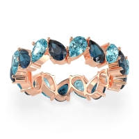 This Swiss Blue Topaz wedding ring is casted in 14K Rose Gold and set with fine quality Swiss Blue Topaz and London Blue Topaz. All of the gemstones we use are of the top 10% available, those found in fine quality boutiques across the world. This Swiss Blue Topaz wedding band can also be added to your collection of minimalist Swiss Blue Topaz rings. This Eternity Band Boasts A Mesmerizing Design with Pear-shaped Stones Facing in Opposite Directions. Free shipping, returns, resizing, and a lifetime warranty ensure you love your purchase.