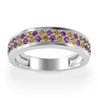 This Amethyst wedding ring is casted in 18k White Gold and set with fine quality Amethyst and Citrine. All of the gemstones we use are of the top 10% available, those found in fine quality boutiques across the world. This Amethyst wedding band can also be added to your collection of minimalist Amethyst rings. This Unique Ring Boasts A Dual Row Of Gemstones, Aligned in The Center And Going Halfway Down The Band. Free shipping, returns, resizing, and a lifetime warranty ensure you love your purchase.