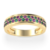 This Amethyst wedding ring is casted in 18k Yellow Gold and set with fine quality Amethyst and Emerald. All of the gemstones we use are of the top 10% available, those found in fine quality boutiques across the world. This Amethyst wedding band can also be added to your collection of minimalist Amethyst rings. This Unique Ring Boasts A Dual Row Of Gemstones, Aligned in The Center And Going Halfway Down The Band. Free shipping, returns, resizing, and a lifetime warranty ensure you love your purchase.