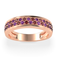 This Amethyst wedding ring is casted in 14K Rose Gold and set with fine quality Amethyst and Ruby. All of the gemstones we use are of the top 10% available, those found in fine quality boutiques across the world. This Amethyst wedding band can also be added to your collection of minimalist Amethyst rings. This Unique Ring Boasts A Dual Row Of Gemstones, Aligned in The Center And Going Halfway Down The Band. Free shipping, returns, resizing, and a lifetime warranty ensure you love your purchase.