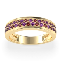 This Amethyst wedding ring is casted in 18k Yellow Gold and set with fine quality Amethyst and Ruby. All of the gemstones we use are of the top 10% available, those found in fine quality boutiques across the world. This Amethyst wedding band can also be added to your collection of minimalist Amethyst rings. This Unique Ring Boasts A Dual Row Of Gemstones, Aligned in The Center And Going Halfway Down The Band. Free shipping, returns, resizing, and a lifetime warranty ensure you love your purchase.