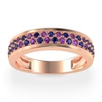 This Blue Sapphire wedding ring is casted in 14K Rose Gold and set with fine quality Blue Sapphire and Amethyst. All of the gemstones we use are of the top 10% available, those found in fine quality boutiques across the world. This Blue Sapphire wedding band can also be added to your collection of minimalist Blue Sapphire rings. This Unique Ring Boasts A Dual Row Of Gemstones, Aligned in The Center And Going Halfway Down The Band. Free shipping, returns, resizing, and a lifetime warranty ensure you love your purchase.