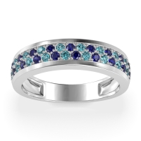 This Blue Sapphire wedding ring is casted in 18k White Gold and set with fine quality Blue Sapphire and Swiss Blue Topaz. All of the gemstones we use are of the top 10% available, those found in fine quality boutiques across the world. This Blue Sapphire wedding band can also be added to your collection of minimalist Blue Sapphire rings. This Unique Ring Boasts A Dual Row Of Gemstones, Aligned in The Center And Going Halfway Down The Band. Free shipping, returns, resizing, and a lifetime warranty ensure you love your purchase.