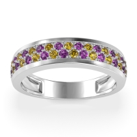 This Citrine wedding ring is casted in 14k White Gold and set with fine quality Citrine and Amethyst. All of the gemstones we use are of the top 10% available, those found in fine quality boutiques across the world. This Citrine wedding band can also be added to your collection of minimalist Citrine rings. This Unique Ring Boasts A Dual Row Of Gemstones, Aligned in The Center And Going Halfway Down The Band. Free shipping, returns, resizing, and a lifetime warranty ensure you love your purchase.