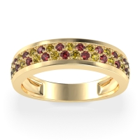 This Citrine wedding ring is casted in 14k Yellow Gold and set with fine quality Citrine and Ruby. All of the gemstones we use are of the top 10% available, those found in fine quality boutiques across the world. This Citrine wedding band can also be added to your collection of minimalist Citrine rings. This Unique Ring Boasts A Dual Row Of Gemstones, Aligned in The Center And Going Halfway Down The Band. Free shipping, returns, resizing, and a lifetime warranty ensure you love your purchase.