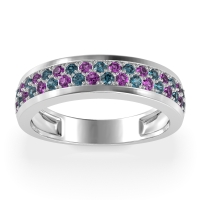 This London Blue Topaz wedding ring is casted in 18k White Gold and set with fine quality London Blue Topaz and Amethyst. All of the gemstones we use are of the top 10% available, those found in fine quality boutiques across the world. This London Blue Topaz wedding band can also be added to your collection of minimalist London Blue Topaz rings. This Unique Ring Boasts A Dual Row Of Gemstones, Aligned in The Center And Going Halfway Down The Band. Free shipping, returns, resizing, and a lifetime warranty ensure you love your purchase.