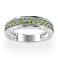 This Peridot wedding ring is casted in Palladium and set with fine quality Peridot and Aquamarine. All of the gemstones we use are of the top 10% available, those found in fine quality boutiques across the world. This Peridot wedding band can also be added to your collection of minimalist Peridot rings. This Unique Ring Boasts A Dual Row Of Gemstones, Aligned in The Center And Going Halfway Down The Band. Free shipping, returns, resizing, and a lifetime warranty ensure you love your purchase.
