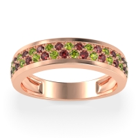 This Peridot wedding ring is casted in 18K Rose Gold and set with fine quality Peridot and Ruby. All of the gemstones we use are of the top 10% available, those found in fine quality boutiques across the world. This Peridot wedding band can also be added to your collection of minimalist Peridot rings. This Unique Ring Boasts A Dual Row Of Gemstones, Aligned in The Center And Going Halfway Down The Band. Free shipping, returns, resizing, and a lifetime warranty ensure you love your purchase.