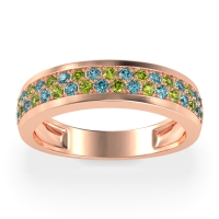 This Peridot wedding ring is casted in 18K Rose Gold and set with fine quality Peridot and Swiss Blue Topaz. All of the gemstones we use are of the top 10% available, those found in fine quality boutiques across the world. This Peridot wedding band can also be added to your collection of minimalist Peridot rings. This Unique Ring Boasts A Dual Row Of Gemstones, Aligned in The Center And Going Halfway Down The Band. Free shipping, returns, resizing, and a lifetime warranty ensure you love your purchase.