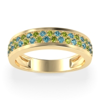 This Peridot wedding ring is casted in 18k Yellow Gold and set with fine quality Peridot and Swiss Blue Topaz. All of the gemstones we use are of the top 10% available, those found in fine quality boutiques across the world. This Peridot wedding band can also be added to your collection of minimalist Peridot rings. This Unique Ring Boasts A Dual Row Of Gemstones, Aligned in The Center And Going Halfway Down The Band. Free shipping, returns, resizing, and a lifetime warranty ensure you love your purchase.