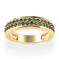 This Ruby wedding ring is casted in 14k Yellow Gold and set with fine quality Ruby and Emerald. All of the gemstones we use are of the top 10% available, those found in fine quality boutiques across the world. This Ruby wedding band can also be added to your collection of minimalist Ruby rings. This Unique Ring Boasts A Dual Row Of Gemstones, Aligned in The Center And Going Halfway Down The Band. Free shipping, returns, resizing, and a lifetime warranty ensure you love your purchase.